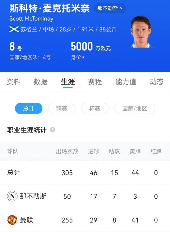 在曼联效力期间,麦克托米奈是一名优秀的球员,他实现了为自己童年梦想的球队效力的愿望,也参加过欧冠,但自从他转会到那不勒斯之后,他就晋升到了另一个层次。